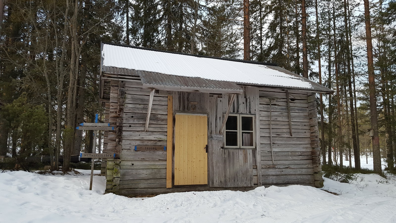 Light was fading fast, so I marched on with a higher pace to try and get to the cabin at Trugbo before dark. Due to the snow slowing me down, however, I had to eventually brake out my headlamp and hike in the dark to the cabin. I passed some old, run down cabins along the way, but didn't waste time inspecting them, as the information on the trail map (see: above) mentioned the cabin at Trugbo as open for hikers. It was very cozy once I settled into the cabin that night. It was snowing outside, and inside there was a nice open fireplace. So I made a small fire, cooked my dinner, and enjoyed the peace and quiet.